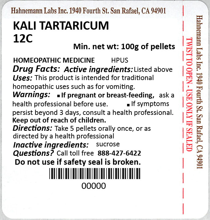 Hahnemann Labs Inc is a producer of homeopathic medicine. This product is Kali Tartaricum in a 100C potency. The medicine comes in the form of pellets weighing a minimum of 100g. The product is intended for traditional homeopathic uses such as vomiting. The inactive ingredient is sucrose. The manufacturer's contact details are available for any questions.*