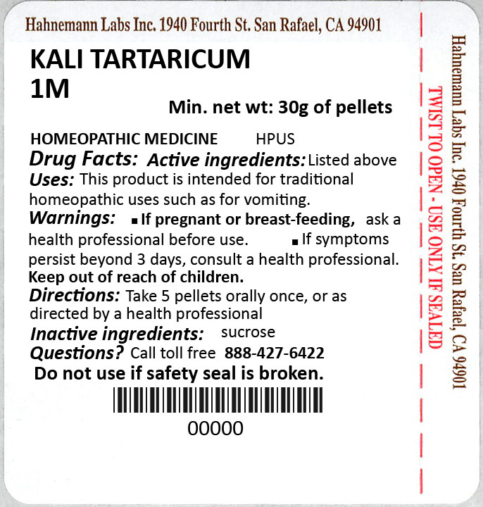 Hahnemann Labs Inc. produces a homeopathic medicine named Kali Tartaricum 1M intended for traditional homeopathic uses such as for vomiting. The active ingredient is not specified in the given text, but the medicine contains 100g of sucrose pellets. The product should not be used in case of broken safety seal and should be kept away from children. Pregnant and breastfeeding women should consult a health professional before using the medicine. Contact toll-free number 888-427-6422 for any queries. The last line of text appears to be non-English characters and cannot be evaluated.*