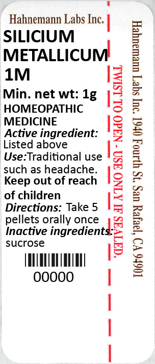 Hahnemann Labs Inc is a homeopathic medicine company located at 1940 Fourth St. San Rafael, CA 94901. They produce a homeopathic medicine called SILICIUM METALLICUM in 100C potency. Each bottle contains a minimum net weight of 5g of pellets. This product is intended for traditional homeopathic uses such as for headache relief. It is important to consult a health professional if pregnant or breastfeeding before using this product. If symptoms persist beyond 3 days, it is also recommended to consult a health professional. The product should be kept out of reach of children. The recommended dosage is to take 5 pellets orally once, or as directed by a health professional. The inactive ingredient in this product is sucrose. For any questions or inquiries, customers can call the toll-free number 888-427-6422. It is advised not to use the product if the safety seal is broken. The remaining text is not readable.*