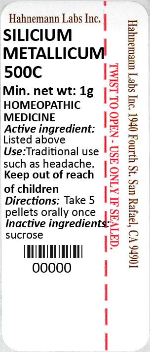 Hahnemann Labs Inc, located at 1940 Fourth St. San Rafael, CA 94901, offers a homeopathic medicine called SILICIUM METALLICUM 500C. This product comes in pellet form with a minimum net weight of 100g. It is intended for traditional homeopathic uses, specifically for headaches. It is important to consult a health professional if pregnant or breastfeeding before use. If symptoms persist beyond 3 days, it is also advised to seek professional advice. The recommended dosage is 5 pellets orally, or as directed by a health professional. The inactive ingredient in this product is sucrose. For any questions or concerns, customers can contact the toll-free number 888-427-6422. It is important not to use the product if the safety seal is broken.*