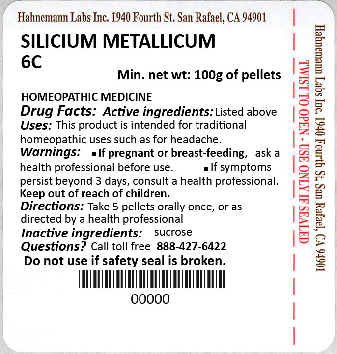 Hahnemann Labs Inc, located at 1940 Fourth St. in San Rafael, CA 94901, offers a homeopathic medicine called SILICIUM METALLICUM in 6C potency. Each bottle contains a minimum net weight of 100g of pellets. This product is intended for traditional homeopathic uses such as relieving headaches. Pregnant or breastfeeding individuals should consult a health professional before using. If symptoms persist beyond 3 days, it is recommended to seek medical advice. The directions for use are to take 5 pellets orally, once, or as directed by a health professional. The only inactive ingredient in this product is sucrose. For any inquiries, a toll-free helpline is available at 888-427-6422. It is important not to use the product if the safety seal is broken.*