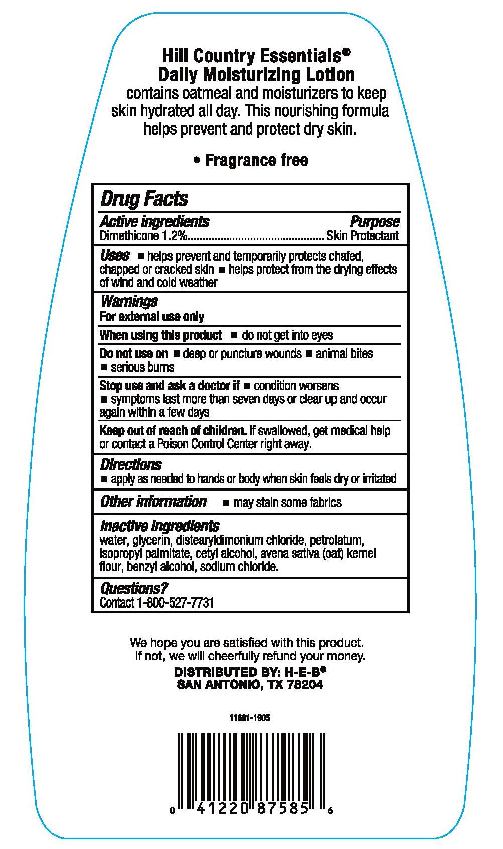 Hill Country Essentials Daily Moisturizing lotion is a nourishing formula containing oatmeal and moisturizers to keep skin hydrated all day. It helps prevent and protect dry skin, and has a fragrance-free formula. The lotion utilizes dimethicone, petrolatum, and sodium chloride to help prevent and temporarily protect chafed, chapped or cracked skin, and to protect from the drying effects of wind and cold weather. The lotion should not be used on deep or puncture wounds, animal bites or serious burns. Stop use and ask a doctor if the condition worsens or if symptoms last more than seven days or reoccur within a few days. The product is distributed by H-E-B® and contains 1.2% Dimethicone. Note that it may stain some fabrics, and if swallowed, contact Poison Control Center right away.*
