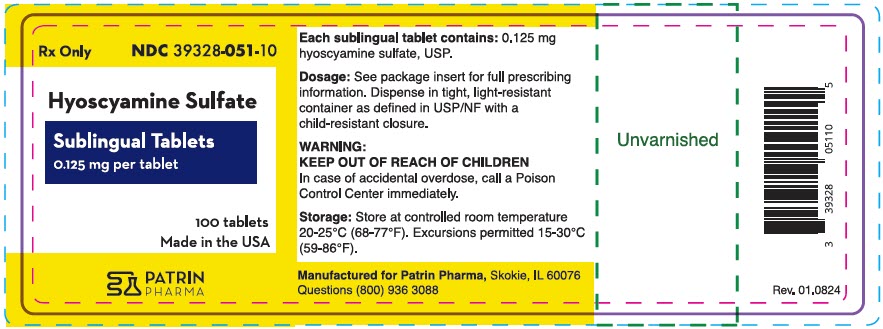 The following 2 images provide visual information about the product associated with Hyoscyamine Sulfate NDC 39328-051 by Patrin Pharma, Inc., such as packaging, labeling, and the appearance of the drug itself. This resource could be helpful for medical professionals, pharmacists, and patients seeking to verify medication information and ensure they have the correct product.