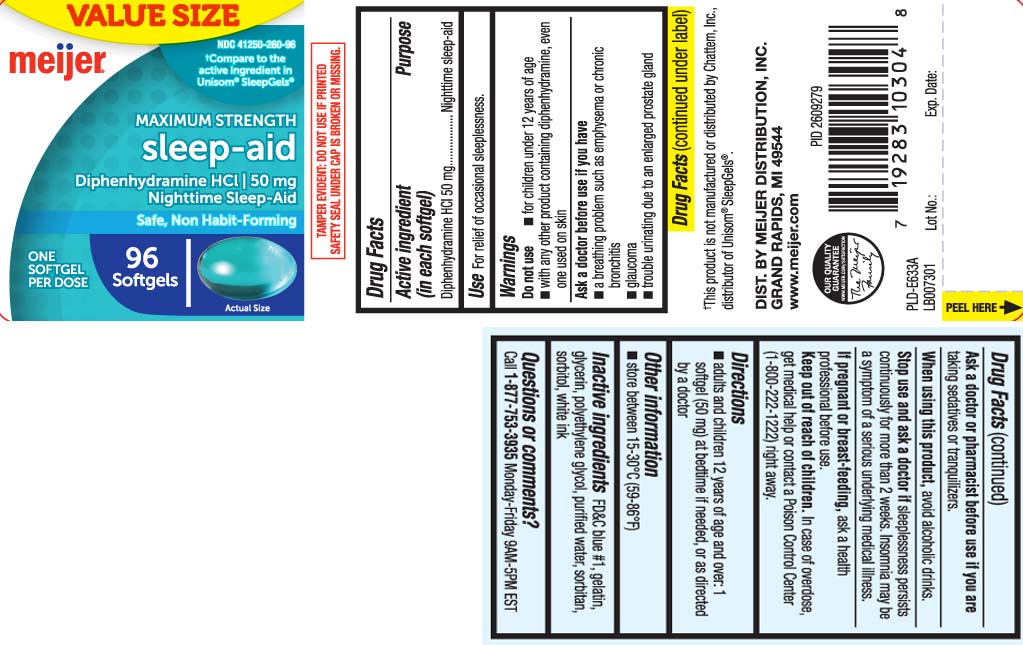 The following image provide visual information about the product associated with Nighttime Sleep Aid NDC 41250-260 by Meijer, Inc., such as packaging, labeling, and the appearance of the drug itself. This resource could be helpful for medical professionals, pharmacists, and patients seeking to verify medication information and ensure they have the correct product.