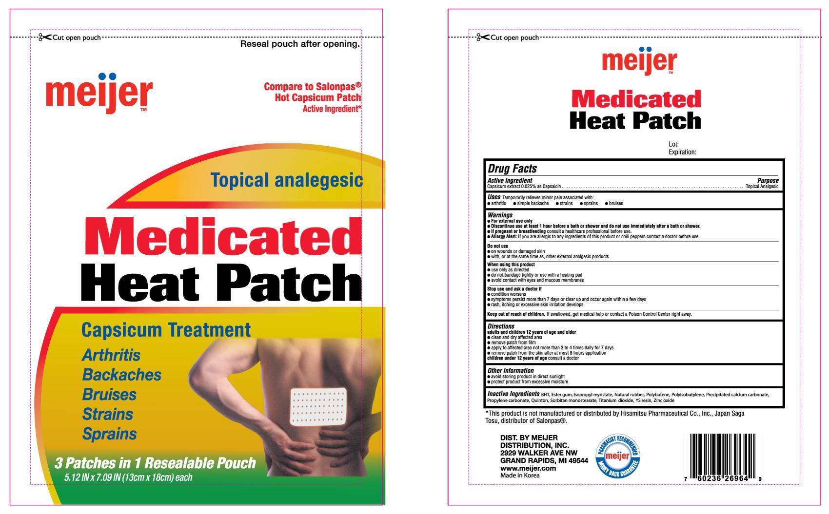 This is a description of a pain relief medicated heat patch manufactured by Meijer. The active ingredient is capsaicin extract which provides temporary relief from minor pains associated with arthritis, backaches, bruises, sprains, and strains. The patches should be used as directed and not exposed to excess moisture and sunlight. The product comes in a resealable package with three patches inside. The size of each patch is 5.12 inches by 7.09 inches (13cm x 18cm). Inactive ingredients include propylene glycol, natural rubber, polysorbate, and zinc oxide. The product is not manufactured by Hisamitsu Pharmaceutical Co. Inc but is distributed by Meijer.*