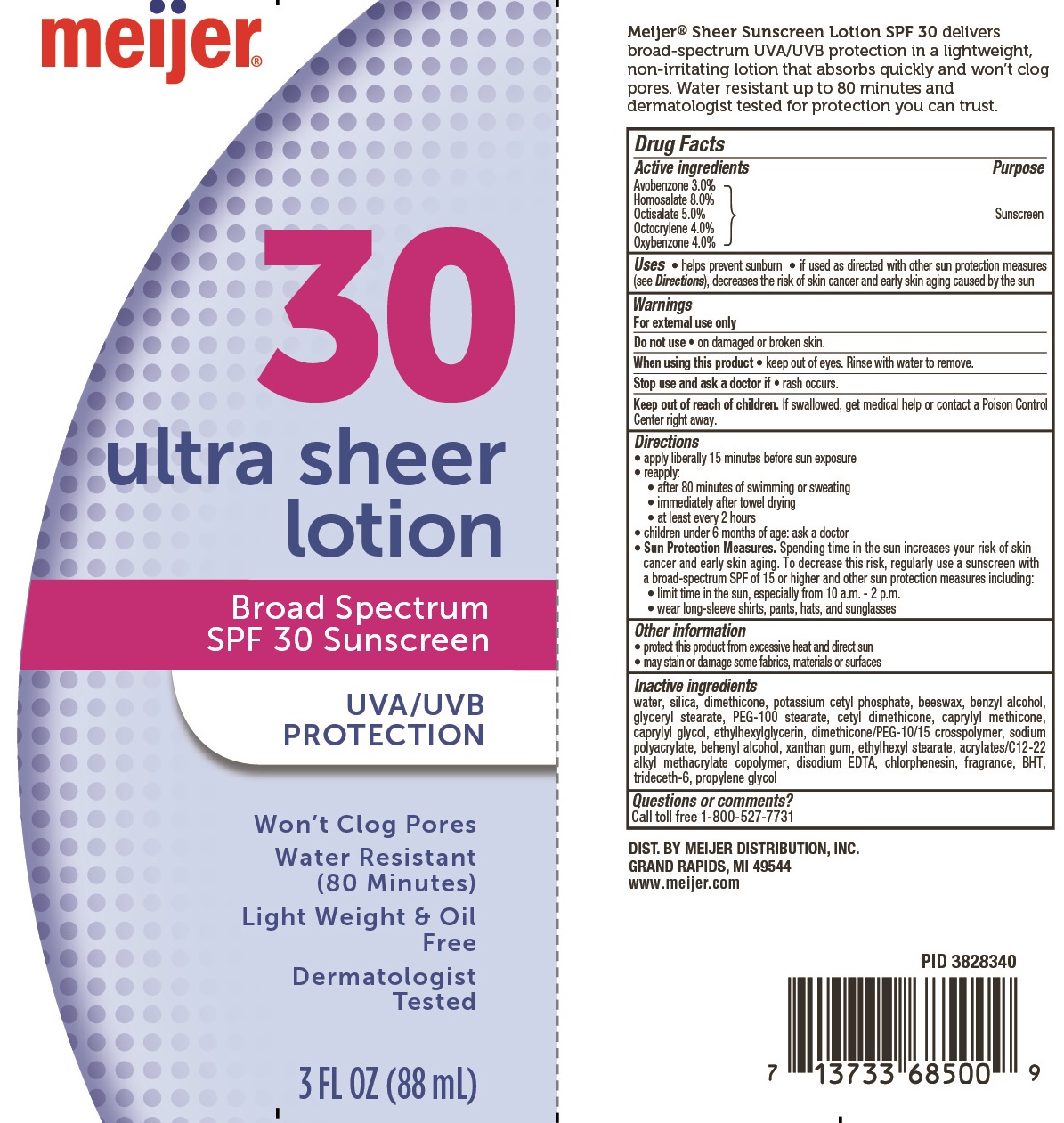 Meijer Sheer Sunscreen Lotion SPF 30 provides broad-spectrum UVA/UVB protection in a lightweight, non-greasy, and water-resistant formula that does not clog pores. This lotion is dermatologist tested and is suitable for sensitive skin. It is also a great option for outdoor water activities as it is water-resistant up to 80 minutes. It contains avobenzone, homosalate, octocrylene, and oxybenzone as active ingredients and is free from oil.*