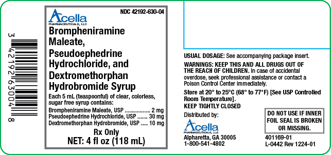This text provides information on a medication with NDC number 42192-630-04 called Acellg Syrup, containing Brompheniramine Maleate, Pseudoephedrine Hydrochloride, and Dextromethorphan Hydrobromide. Each 5 mL of the syrup contains these active ingredients. The usual dosage and storage instructions are provided along with warnings to keep the drug out of reach of children and what to do in case of accidental overdose. The product is packaged in a 4 fl oz (118 mL) bottle. It also includes contact information for distribution and a warning not to use if the inner foil seal is broken.*
