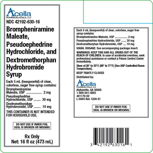 The following 5 images provide visual information about the product associated with Brompheniramine Maleate, Pseudoephedrine Hydrochloride, Dextromethorphan Hydrobromide NDC 42192-630 by Acella Pharmaceuticals, Llc, such as packaging, labeling, and the appearance of the drug itself. This resource could be helpful for medical professionals, pharmacists, and patients seeking to verify medication information and ensure they have the correct product.