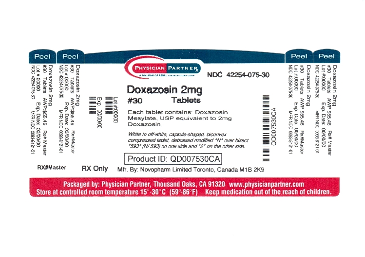 The following 4 images provide visual information about the product associated with Doxazosin NDC 42254-075 by Rebel Distributors Corp, such as packaging, labeling, and the appearance of the drug itself. This resource could be helpful for medical professionals, pharmacists, and patients seeking to verify medication information and ensure they have the correct product.
