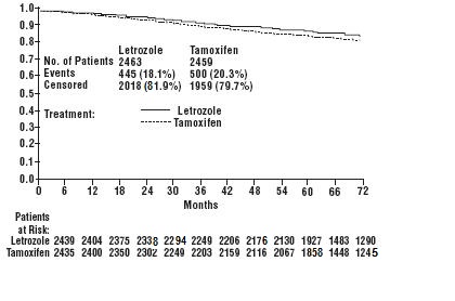 In this document, the letrozole and Tamoxifen treatment is compared for 2453 and 2450 patients respectively. The patients treated with letrozole were 20.3% higher than those treated with Tamoxifen. The text also has a table showing the number of patients for each treatment at different intervals (in months). The table has two columns ("letrozole" and "Tamoxifen") and 12 rows indicating the number of patients for each month.*
