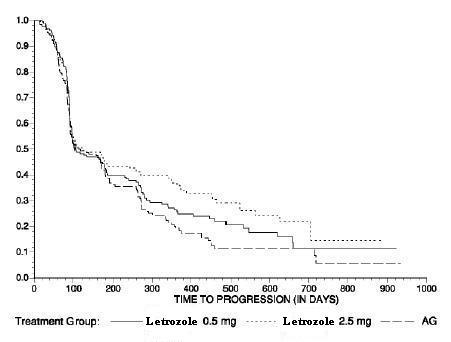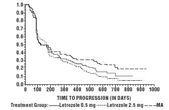 This text provides information about the time to progression (in days) for two different treatment groups: Letrozole 0.5 mg and Letrozole 2.5 mg. It does not provide additional context or information.*
