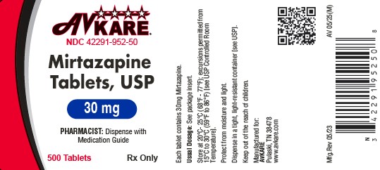 The following 2 images provide visual information about the product associated with Mirtazapine NDC 42291-952 by Avkare, such as packaging, labeling, and the appearance of the drug itself. This resource could be helpful for medical professionals, pharmacists, and patients seeking to verify medication information and ensure they have the correct product.