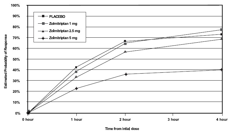 This text provides information on the percentage distribution of Zolmitriptan Orally Disintegrating Tablets (2.5 mg) and Placebo over time intervals from 0.5 hour to 2 hours after the initial dose.*