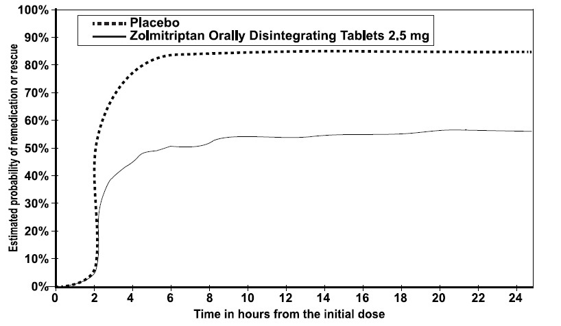 This text appears to be a chart or table related to Zolmitriptan Orally Disintegrating Tablets, specifically focusing on the estimated probability of remedication or rescue over a period of 24 hours after the initial dose. It likely provides information on the dosage strength of 2.5 mg and how it correlates with the likelihood of needing additional medication within specific time intervals.*