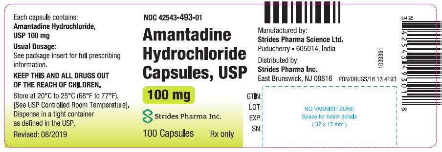 The following 2 images provide visual information about the product associated with Amantadine Hydrochloride NDC 42543-493 by Strides Pharma Inc., such as packaging, labeling, and the appearance of the drug itself. This resource could be helpful for medical professionals, pharmacists, and patients seeking to verify medication information and ensure they have the correct product.