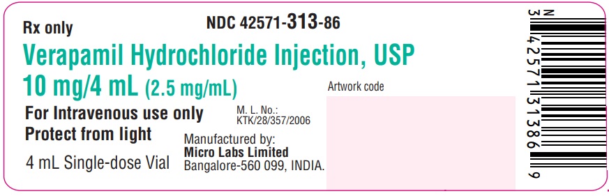 Verapamil Hydrochloride Injection is a medication for intravenous use only and is manufactured by Micro Labs Limited in Bangalore, India. The medication is available in a 4 mL single-dose vial and contains 10 mg/4 mL (2.5 mg/mL) of Verapamil Hydrochloride. It should be protected from light. The product is labeled as Rx only with the National Drug Code (NDC) 42571-313-86. There is some unreadable text in the image.*
