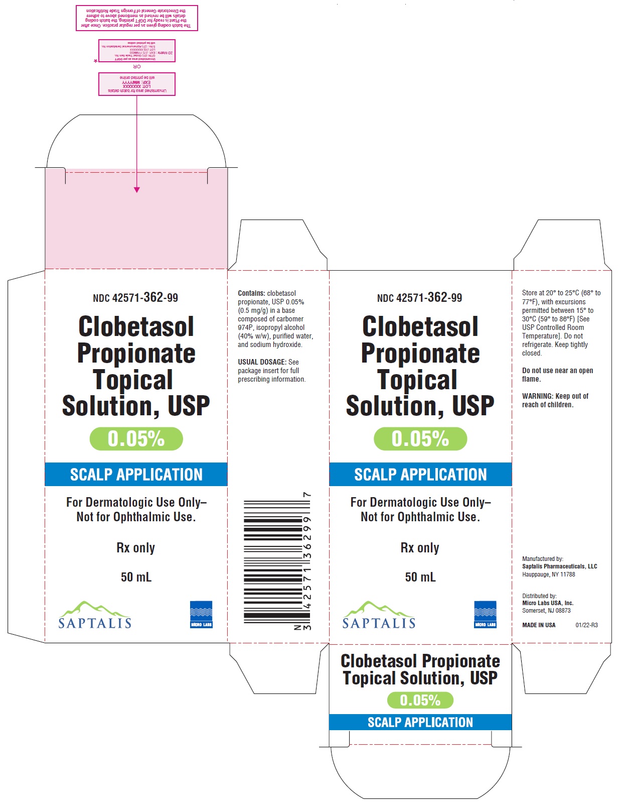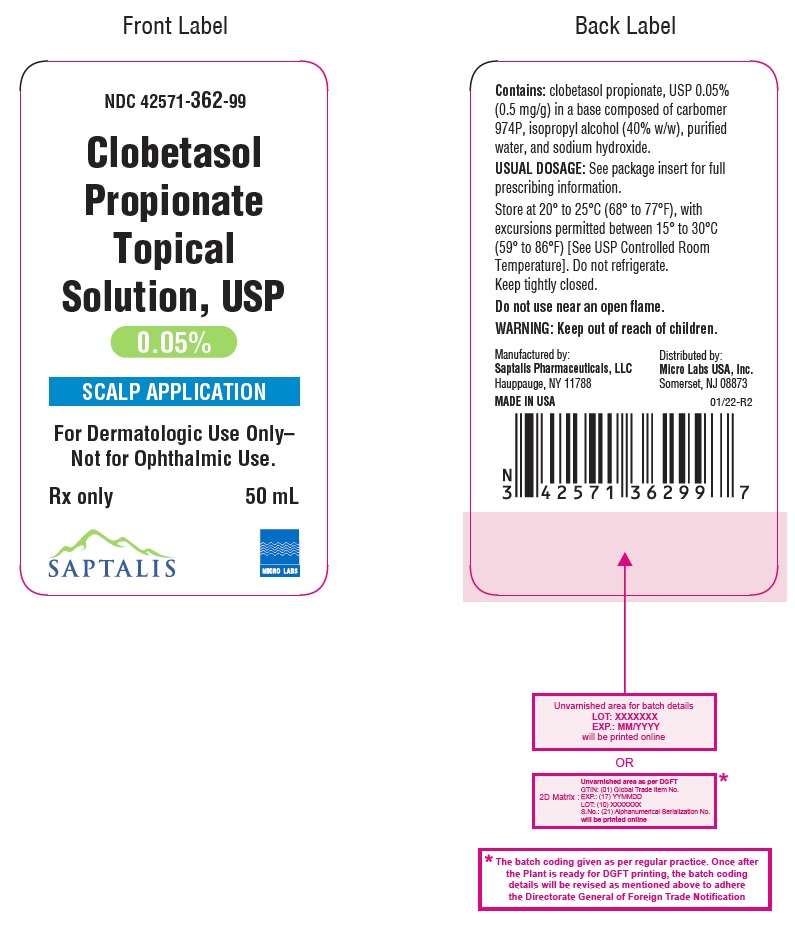 Clobetasol Propionate Topical Solution, USP is a dermatologic solution containing 0.05% clobetasol propionate in a base composed of carbomer 974P, isopropyl alcohol, purified water, and sodium hydroxide. It is indicated for dermatologic use only and should not be used near any open flame. It is manufactured by Saptalis Pharmaceuticals, LLC and distributed by Micro Labs USA, Inc. The solution comes in a 50 mL bottle and should be stored between 20-25°C (68-77°F), with excursions permitted between 15-30°C (50-86°F). The product label advises that it should be kept tightly closed and out of reach of children.*