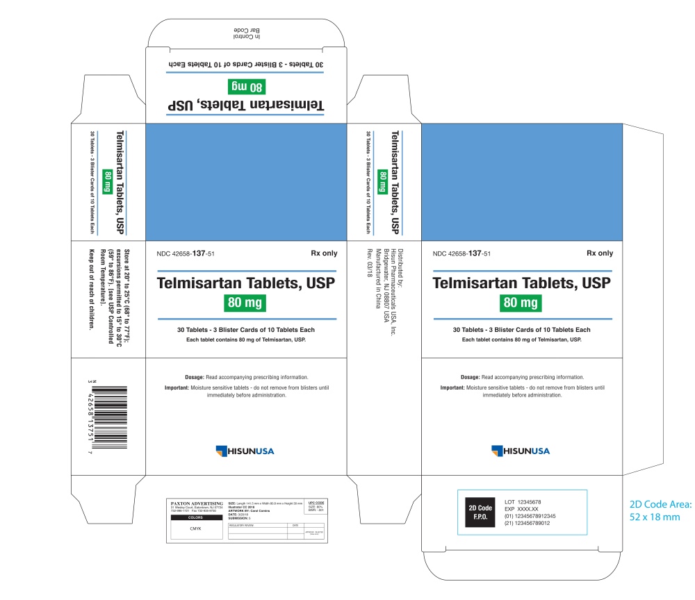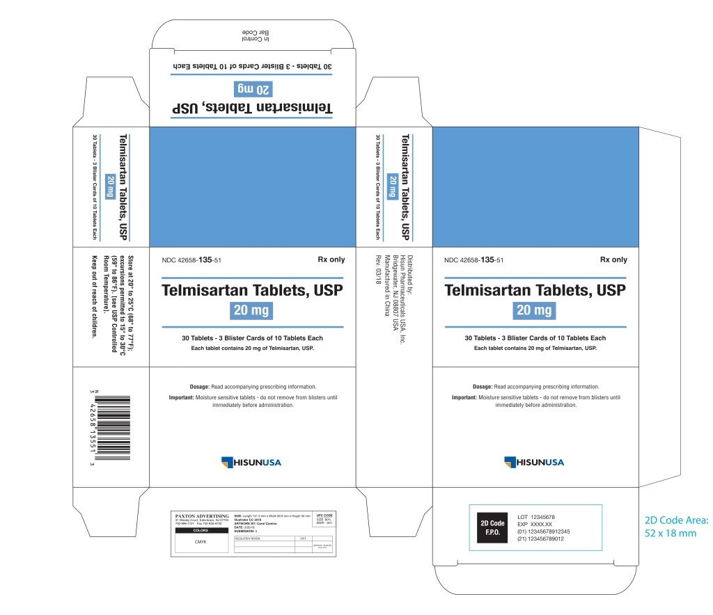 The following 7 images provide visual information about the product associated with Telmisartan NDC 42658-135 by Hisun Pharmaceuticals Usa, Inc., such as packaging, labeling, and the appearance of the drug itself. This resource could be helpful for medical professionals, pharmacists, and patients seeking to verify medication information and ensure they have the correct product.