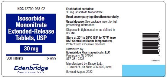 Description: This is a description of Isosorbide Mononitrate Extended-Release Tablets. Each tablet contains 30 mg of Isosorbide Mononitrate. The tablets are available in a pack of 100 and are intended for prescription use only. The accompanying directions should be read carefully. The usual dosage should be followed as mentioned in the package insert. The tablets should be stored in a tightly closed container at a temperature between 20°C to 25°C (68°F to 77°F) in a controlled room temperature environment. Excessive moisture should be avoided. The tablets are distributed by Edenbridge Pharmaceuticals, located in Parsippany, NJ. For any inquiries, contact 877-381-3336. The tablets are manufactured by Dexcel Ltd., located in Or Akiva, Israel. The revision date of the information is August 2022.*
