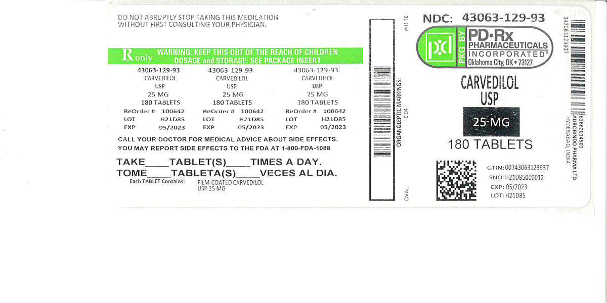 The following 6 images provide visual information about the product associated with Carvedilol NDC 43063-129 by Pd-rx Pharmaceuticals, Inc., such as packaging, labeling, and the appearance of the drug itself. This resource could be helpful for medical professionals, pharmacists, and patients seeking to verify medication information and ensure they have the correct product.