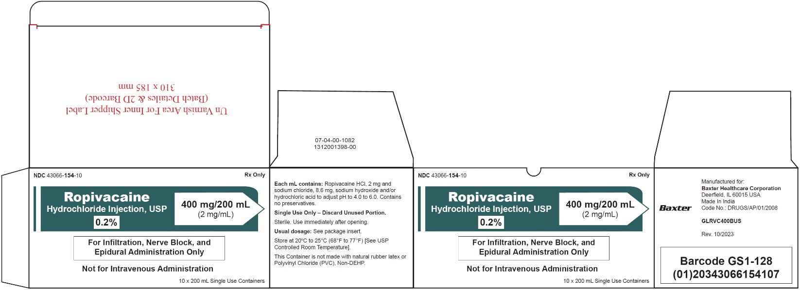This text appears to be the package insert information for a medication. The medication is labeled with the NDC code 43066-154-01 and the brand name has the initials "LG TR T 1] T." The medication is intended for infiltration, nerve block, and epidural administration. It contains 400 mg of a substance called Ropivacaine HCI per 200 mL of solution, which is equivalent to a concentration of 2 mg/mL. It is important to note that this medication is not intended for intravenous administration. Each milliliter of the solution also contains sodium chloride and the pH is adjusted using sodium hydroxide and/or hydrochloric acid. There are no preservatives in the solution. The instructions state that the medication is single-use only, and any unused portion should be discarded. It is also necessary to use the medication immediately after opening, as it is sterile. The usual dosage information is provided in the package insert. Proper storage of the medication is recommended at a temperature between 20°C to 25°C (68°F to 77°F), following the standards of USP Controlled Room Temperature. The container closure of the medication does not contain natural rubber latex or Polyvinyl Chloride (PVC), specifically mentioning that it is Non-DEHP. The medication is manufactured by Baxter Healthcare Corporation located in Deerfield, IL, USA, but it is made in India. The document also includes various additional codes and a barcode (GS1-128) for tracking purposes.*