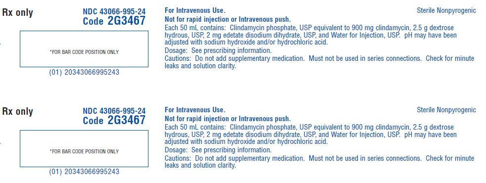 This is an Rx-only medication with NDC code 43066-995-24 and code 2G3467. The barcode position is specified for the same. The medication is for intravenous use and is sterile and nonpyrogenic. The medication is not suitable for rapid injection or IV push. The 50 mL solution has clindamycin phosphate, dextrose hydrous, edetate disodium dihydrate, and water for injection. The pH level may have been adjusted with sodium hydroxide and/or hydrochloric cid. It is advised not to add any more medication, must not be used in series connections and solution clarity should be checked for minute leaks. Dosage information is available in prescribing information.*