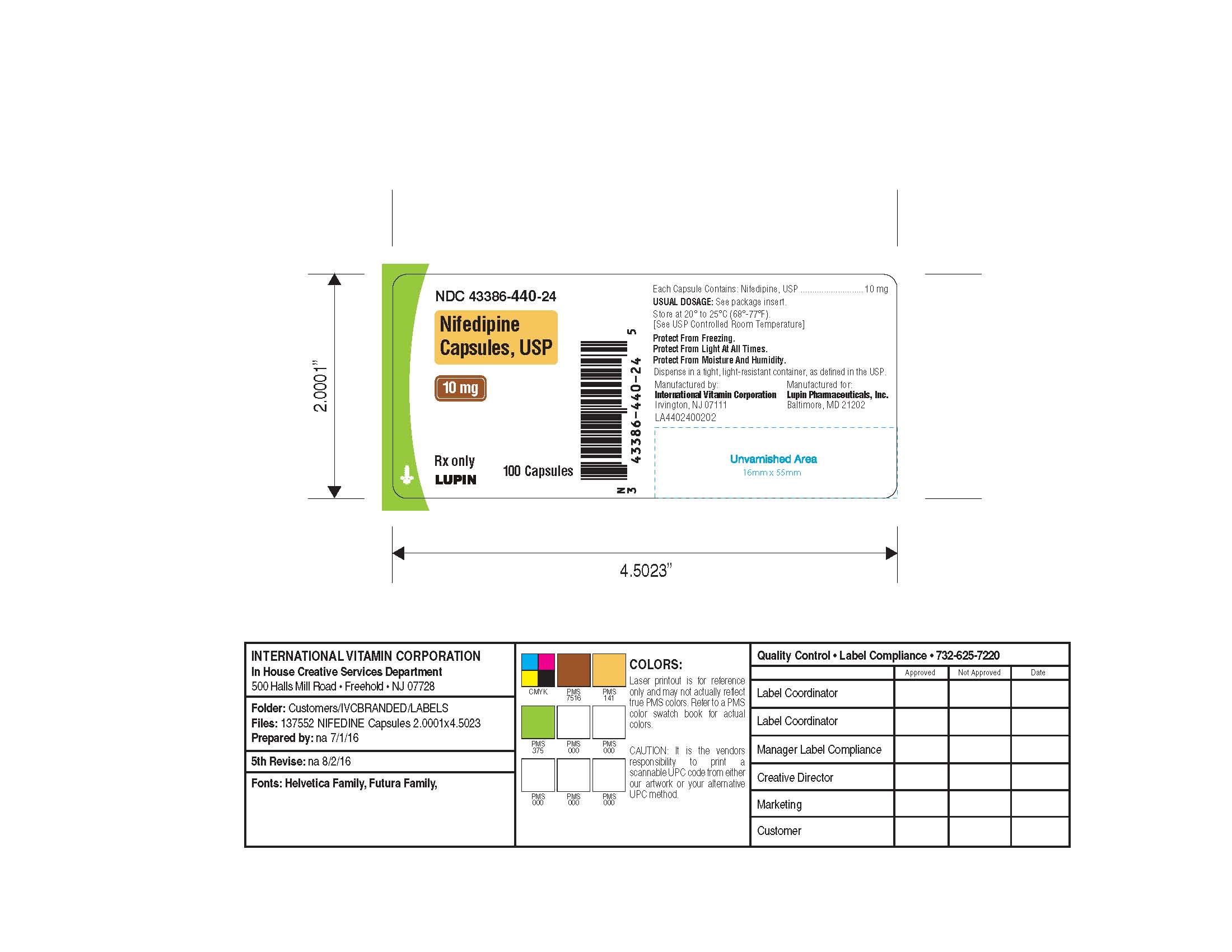 Each capsule of this medicine contains 10mg of Nifedipine, USP. It is recommended to store between 20-25°C to maintain its efficacy. Nifedipine capsules should be protected from moisture, light, and humidity. Additionally, it should be dispensed only in a tightly closed container. The manufacturer of the medicine is International Vitamin Corporation while it is manufactured for Lupin Pharmaceuticals Inc. The package contains 100 capsules. This text seems to be an insert found in a package.*