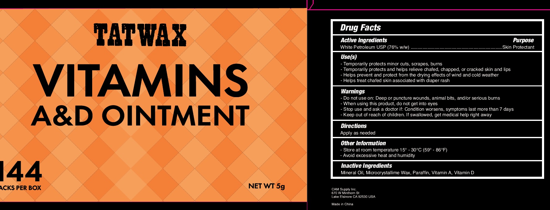 TATWAX is a skin protectant containing White Petroleum USP. It is designed to temporarily protect and help relieve minor cuts, scrapes, burns, chafed, chapped, or cracked skin and lips. It also aids in preventing and protecting against the drying effects of wind and cold weather and is effective in treating chafed skin associated with diaper rash. It should not be used on deep wounds, animal bites, or serious burns. It is advised to avoid contact with eyes and to seek medical attention if the condition worsens or symptoms persist for more than 7 days. The product should be kept out of reach of children and if ingested, medical help should be sought immediately. It is recommended to apply as needed and store at room temperature, avoiding excessive heat and humidity. The product is manufactured by CAM Supply Inc., located in Lake Elsinore, CA, USA, and is made in China.*