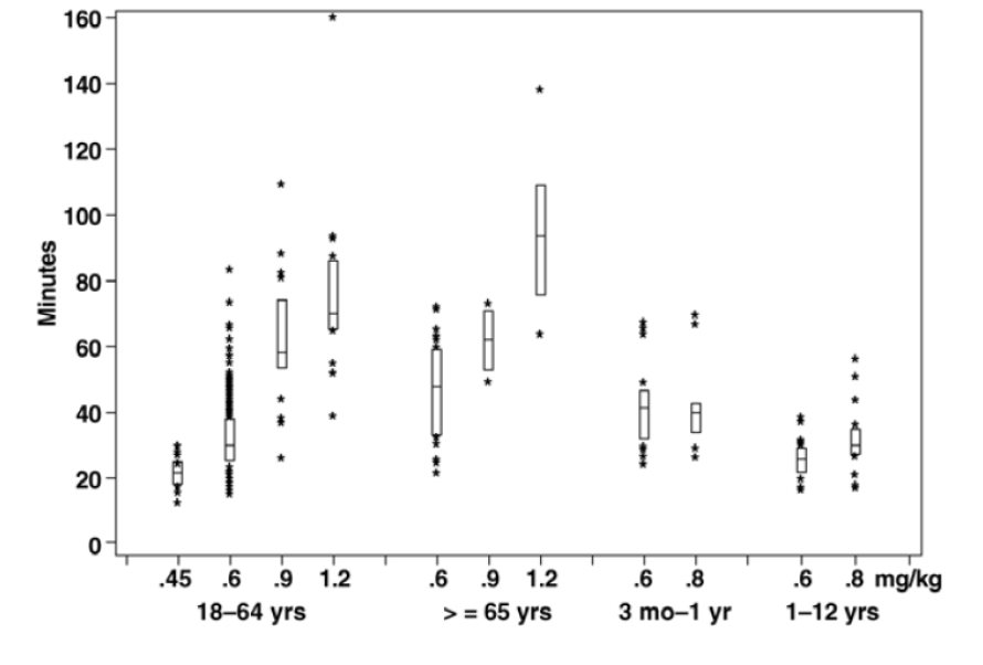 This appears to be a chart or graph showing the number of minutes against different dosages for different age groups. The age group ranges from 3 months to over 65 years old. The dosages are measured in mg/kg. It seems that the graph is displaying the amount of time for the medication to take effect (in minutes) for different age groups and dosages.*
