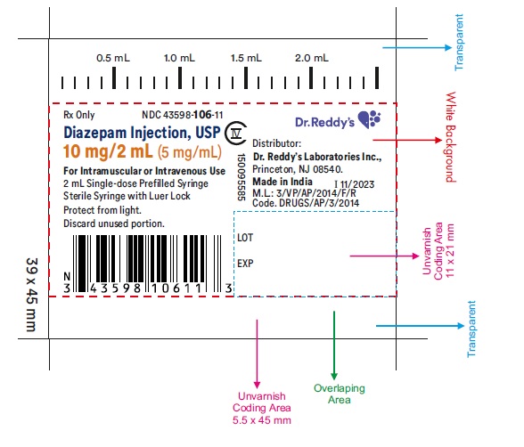 The following 4 images provide visual information about the product associated with Diazepam NDC 43598-106 by Dr. Reddy's Laboratories Inc, such as packaging, labeling, and the appearance of the drug itself. This resource could be helpful for medical professionals, pharmacists, and patients seeking to verify medication information and ensure they have the correct product.