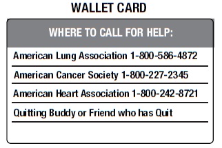 The text provides information about a wallet card with contact details for organizations that provide help and information. The American Lung Association, American Cancer Society, and American Heart Association offer support via phone numbers listed on the card. Additionally, it suggests seeking help from a quitting buddy or friend who has quit.*