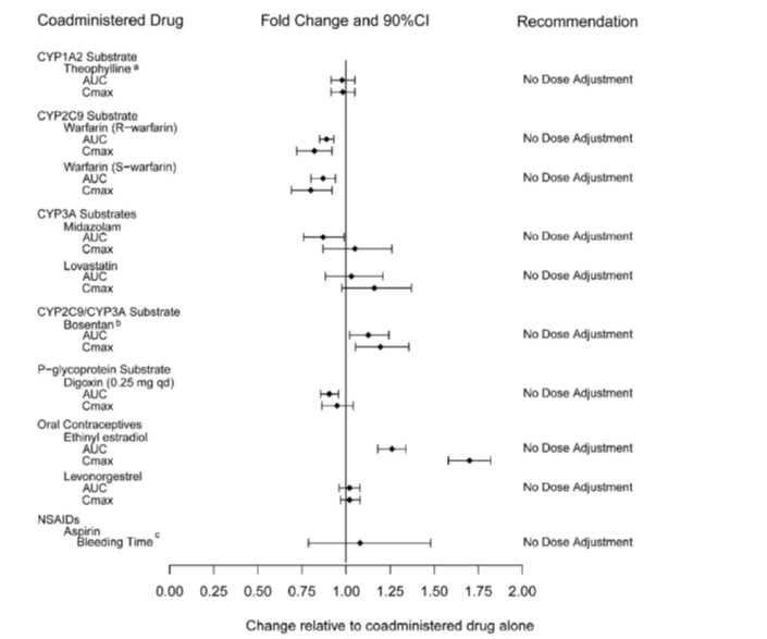 This text seems to be a comparison chart of different drugs and their effectiveness when co-administered with Tadalafil. It shows which drugs may inhibit or induce enzymes (CYPaA) that metabolize Tadalafil and cause a change in its effectiveness. The chart includes fold change and 90% Cl (confidence interval) for each drug and suggests whether a dose adjustment is necessary or not. However, the data seems incomplete without headings and proper formatting, and it may not be useful for medical practitioners without additional information.*