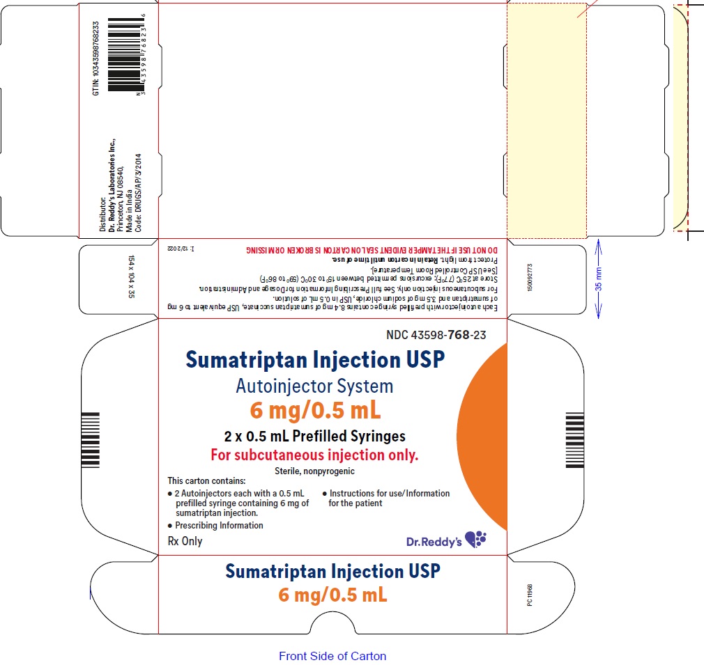 GTIN: 1034359876823 and NDC 43598-768-23 refers to a Sumatriptan Injection USP Autoinjector System with 6 mg/0.5 mL concentration. The carton contains 2 Autoinjectors each prefilled syringe cor sumatriptan injection and is for subcutaneous injection only. The product is sterile and nonpyrogenic. The text contains a mix of English and non-English characters and symbols making it difficult to understand.*