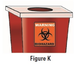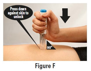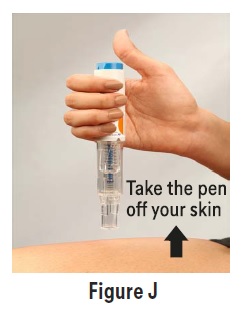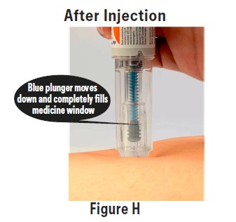 This text is describing the physical changes in a medical injection device after injection. The blue plunger moves and the medicine window is filled. Figure H is likely a visual representation of the device and its components.*
