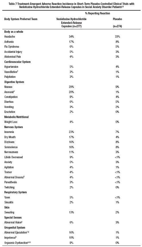 This is a report on the incidence of treatment-emergent adverse reactions in clinical trials comparing Vonlafine Hydrochloride with a placebo for patients with social anxiety disorder. The table includes data on adverse reactions in different body systems.*