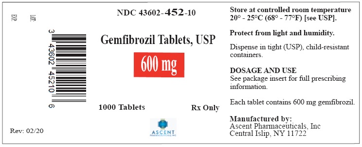 The following 7 images provide visual information about the product associated with Gemfibrozil NDC 43602-452 by Ascent Pharmaceuticals, Inc., such as packaging, labeling, and the appearance of the drug itself. This resource could be helpful for medical professionals, pharmacists, and patients seeking to verify medication information and ensure they have the correct product.