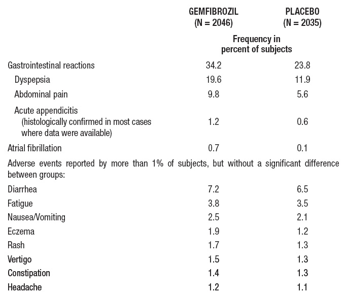 This text provides a comparison between the frequency of adverse reactions reported in a group of 2046 subjects receiving Gemfibrozil versus a group of 2035 subjects receiving a placebo treatment. The data shows that Gemfibrozil patients reported higher frequencies of gastrointestinal reactions, dyspepsia, abdominal pain, acute appendicitis, and atrial fibrillation than those taking placebo treatment. However, adverse events like diarrhea, fatigue, nausea/vomiting, eczema, rash, vertigo, constipation, and headache did not show any significant differences between the two groups.*