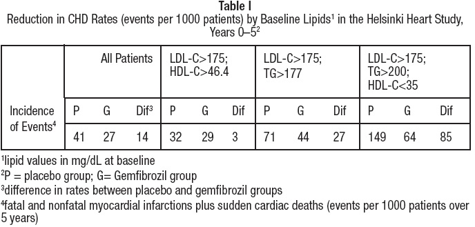 This is a table showing the reduction in coronary heart disease rates in patients over a 5-year period based on their baseline lipid levels. The table displays the number of events per 1000 patients and the difference in rates between the placebo and gemfibrozil groups. The lipid values at baseline for the patients are shown in mg/dL. The events considered in the study include fatal and non-fatal myocardial infarctions and sudden cardiac deaths.*