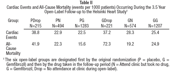 The table shows the number of cardiac events and all-cause mortality per 1000 patients during the 3.5 year open-label follow-up to the Helsinki Heart Study. The data is grouped based on the original randomization (placebo or gemfibrozil) and drug taken during follow-up (N=attend clinic but took no drug, G=gemfibrozil, or Drop=no attendance at clinic). The table includes data for 215, 494, 1283, 221, 574, and 1207 patients.*