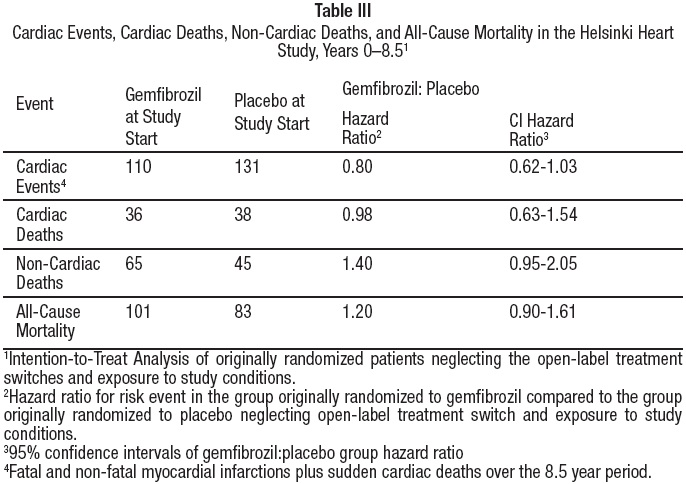 This is a table titled "Cardiac Events, Cardiac Deaths, Non-Cardiac Deaths, and All-Cause Mortality in the Helsinki Heart Study, Years 0-8.5." It compares the effects of Gemfibrozil and placebo on Cardiac Events, Cardiac Deaths, Non-Cardiac Deaths, and All-Cause Mortality. The table includes data on Event numbers, Hazard ratios, Cardiac Deaths, Non-Cardiac Deaths, and All-Cause Mortality, and their corresponding values for Gemfibrozil and Placebo. It is an analysis of the originally randomized patients neglecting the open-label treatment switches and exposure to study conditions.*