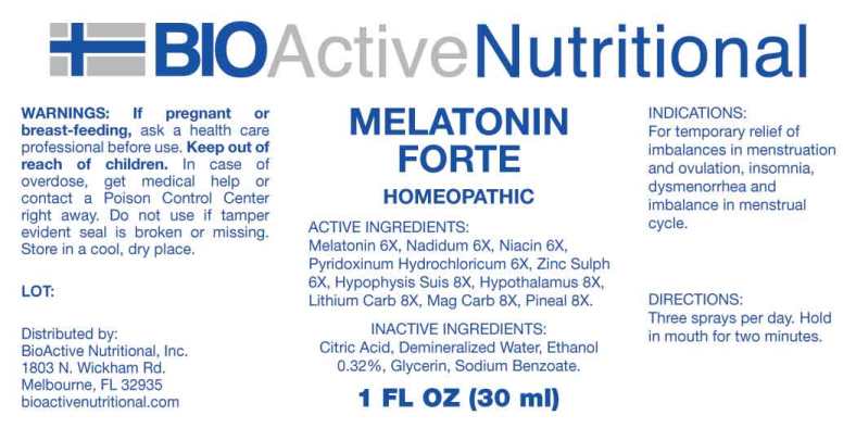 This is a warning label and usage guide for a homeopathic product called Melatonin Forte, distributed by BioActive Nutritional, Inc. The product contains various active and inactive ingredients including Melatonin, Nadidum, Niacin, Pyridoxinum Hydrochioricum, Zinc Sulph 6X, Hypophysis Suis 8X, Hypothalamus 8X, Lithium Carb 8X, Mag Carb 8X and Pineal 8X. It is recommended to avoid using this product if the tamper-evident seal is broken, and to store it in a cool, dry place. Users who are pregnant or breastfeeding are advised to consult a healthcare professional before use, and the product should be kept out of reach of children. The product is indicated for temporary relief of imbalances in menstruation and ovulation, insomnia, dysmenorrhea, and imbalances in the menstrual cycle. The recommended dosage is three sprays per day, to be held in the mouth for two minutes.*