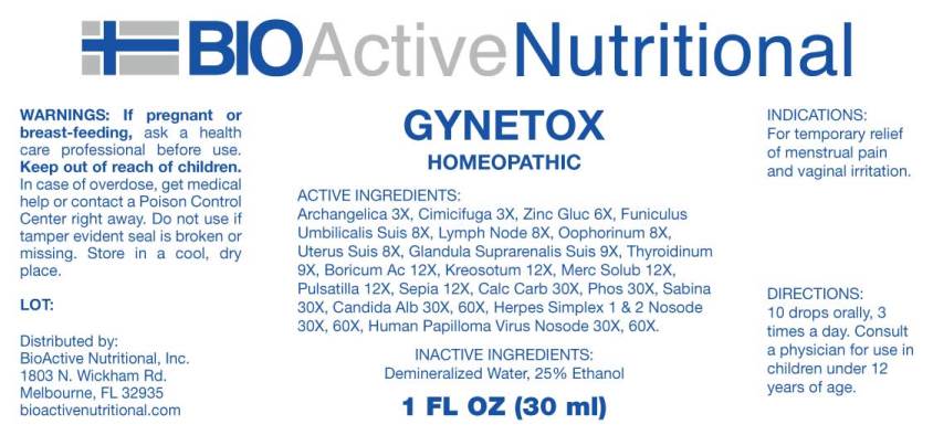 BioActive Nutritional's GYNETOX is a homeopathic remedy used for temporary relief of menstrual pain and vaginal irritation. It contains a blend of active ingredients such as Archangelica 3X, Cimicifuga 3X, and Zinc Gluc 6X. This product should only be used as directed, and children under 12 years of age should consult a physician before use. If pregnant or breastfeeding, consult a healthcare professional before using. Keep out of reach of children, and store in a cool, dry place.*