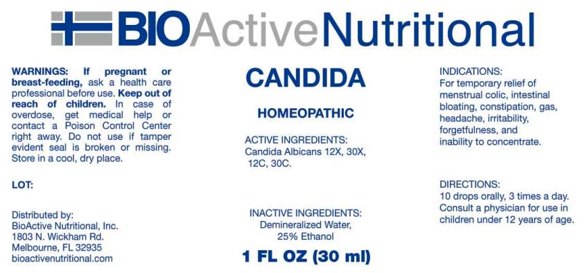 This is a medication that contains the active ingredient Candida Albicans in various potencies for the temporary relief of menstrual colic, constipation, gas, headache, irritability, forgetfulness, and inability to concentrate. It is recommended to consult a physician before use if you are pregnant or nursing, and to keep it out of the reach of children. It is also advised to seek medical attention if an overdose occurs. The product is distributed by BioActive Nutritional, Inc. and should be stored in a cool, dry place. The package contains instructions to take ten drops of the medication orally, three times a day.*