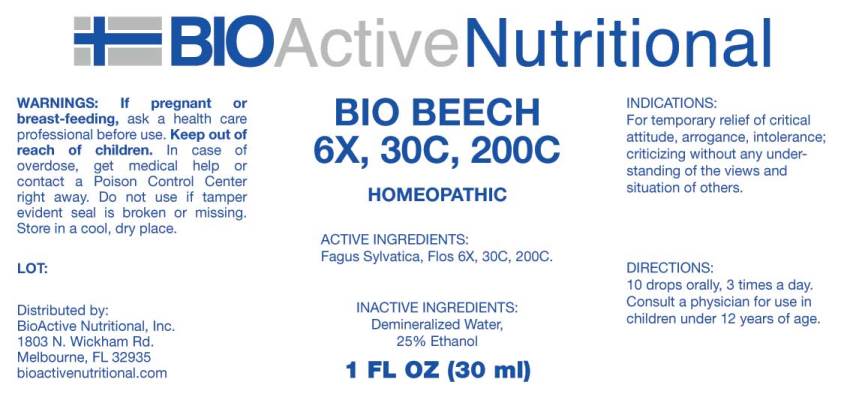 BIO Beech is a homeopathic product with Fagus Sylvatica, Flos as active ingredients. It aims to provide temporary relief from intolerance, arrogance, and critical attitude, as well as criticizing others without understanding their views or situations. The recommended dosage is 10 drops orally, 3 times a day, and it is advised to consult a physician before using it in children under 12 years of age. This product is distributed by BioActive Nutritional, Inc. and comes with standard warnings for usage during pregnancy, breastfeeding, overdose, and storage.*