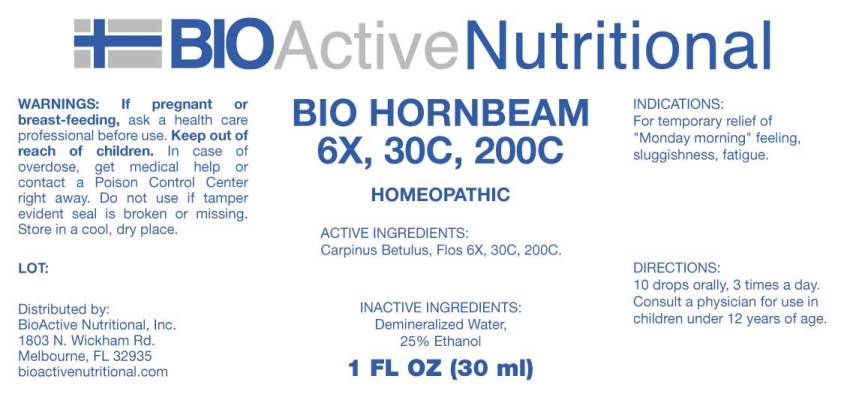 BIOA ctiveNutritional presents Hornbeam as a homeopathic remedy that may help reduce temporary symptoms of fatigue, sluggishness, and a "Monday morning" feeling. The active ingredients include garpinus betulus, fios 6X, 30, and 200C. The remedy comes in a 1 fl oz (30 ml) bottle that contains 25% ethanol and demineralized water. It is recommended to take 10 drops orally, three times a day, and consult a physician before use in children under 12 years old. It is important not to use it if the tamper-evident seal is broken or missing, and it needs to be kept out of reach of children. If pregnant or breastfeeding, it is suggested to ask a healthcare professional before use. Lastly, if an overdose is suspected, immediate medical attention or contact with a Poison Control Center is necessary. The product is distributed by BioActive Nutritional, Inc., and their contact information is listed on the label.*