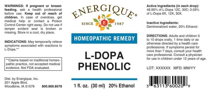 This is a homeopathic remedy marketed by Energique, Inc. It contains L-Dopa phenolic and is indicated to temporarily relieve symptoms associated with reactions to L-Dopa. The product comes in a 1fl oz. bottle with 20% ethanol and should be taken orally by adults and children over 5 years old. It should be stored in a cool and dry place and kept out of reach of children. If pregnant or breastfeeding, one should ask a healthcare professional before use. This product is not FDA evaluated and its claims are based on traditional homeopathic practice, not accepted medical evidence.*