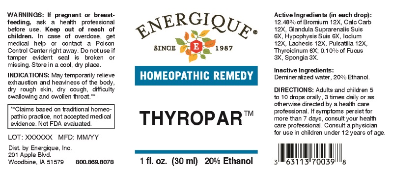This is a homeopathic remedy called Thyropar that may temporarily relieve exhaustion, dry skin, dry cough, difficulty swallowing, and swollen throat. The product comes in a 1fl. oz. bottle with 20% Ethanol and contains active and inactive ingredients. The product should be kept out of reach of children, and pregnant or breastfeeding individuals should consult a health professional before use. In case of overdose, medical help should be sought immediately. The product is distributed by Energique Inc. and has not been FDA evaluated. The lot number is X000K and was manufactured in MMAYY. Dosage instructions are provided and should be followed, and individuals should consult a healthcare professional if symptoms persist for more than seven days or for children under 12 years of age.*