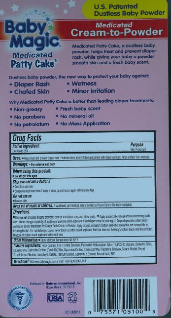 The following image provide visual information about the product associated with Baby Magic Medicated Patty Cake NDC 45765-5100 by Naterra International Inc., such as packaging, labeling, and the appearance of the drug itself. This resource could be helpful for medical professionals, pharmacists, and patients seeking to verify medication information and ensure they have the correct product.