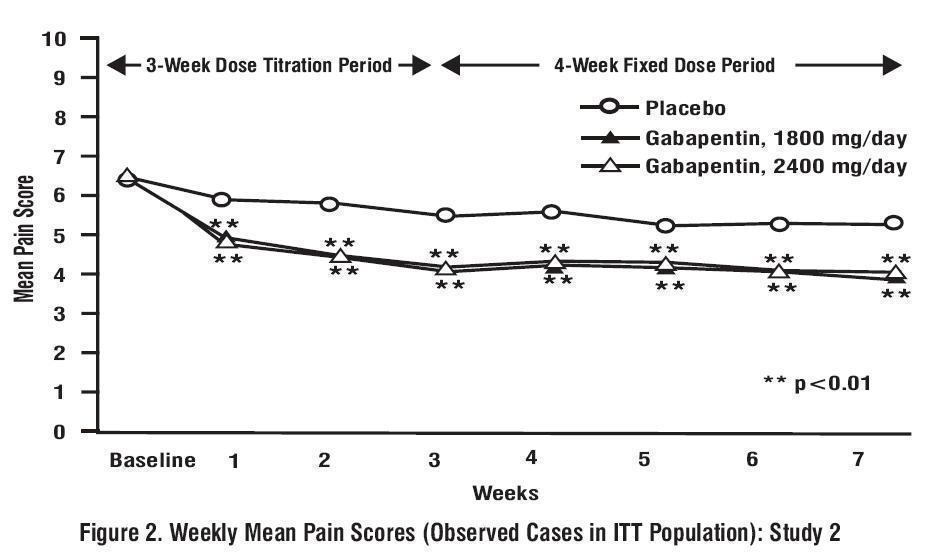 The figure shows the mean pain score over a period of eight weeks, with a four-week dose titration period followed by a four-week fixed dose period. The medication being studied is Gabapentin, with a maximum dose of 3600 mg/day, and a placebo is also included for comparison. The mean pain score decreases over time for both the Gabapentin and placebo groups. Statistics indicate a significant difference between the two groups with p<0.01.*
