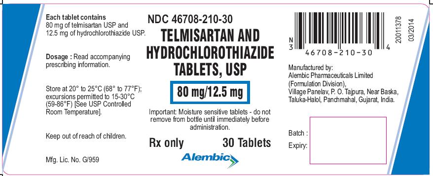 This is a description of a medication containing 80 mg of telmisartan USP and 12.5 mg of hydrochlorothiazide USP to be taken according to accompanying prescribing information. The tablets should be kept in a bottle at a controlled room temperature between 20°C and 25°C, with permitted excursions from 15-30°C. The medication is moisture sensitive and should not be removed from the bottle until immediately before administration. The bottle contains 30 tablets and should be kept out of reach of children. The manufacturer of the medication is Alembic Pharmaceuticals, located in India. The batch number and expiry date are provided.*